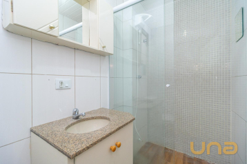 Banheiro com box de vidro, armários e espelho.