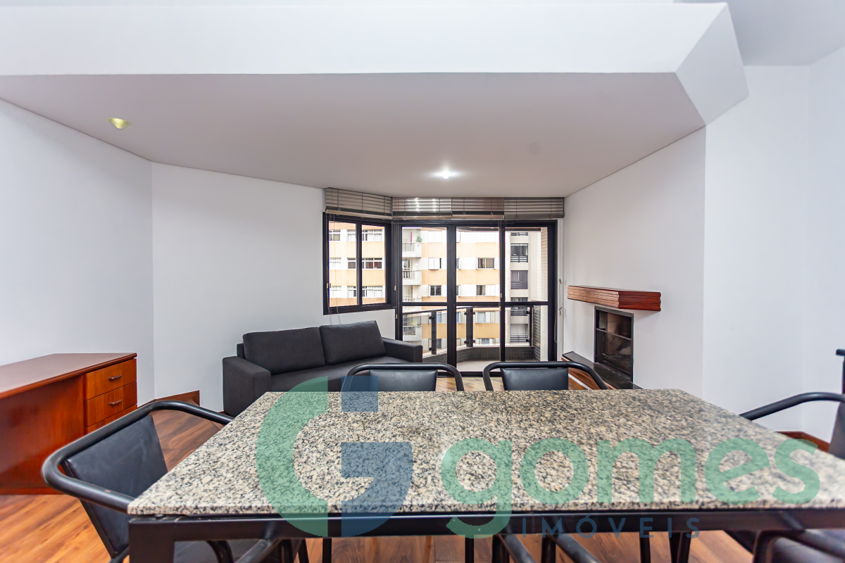 Imóvel: Sala para 02 ambientes em 02 níveis com mesa de 6 lugares, persianas, balcão, sofá, lareira e acesso a sacada, lavabo, cozinha com armários, fogão, geladeira, micro-ondas, área de serviço com máquina de lavar roupas