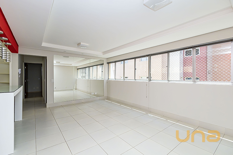 Sala ampla para 2 ambientes, com sancas em gesso, luminárias embutidas e luminárias paflon, espelhos grandes, persianas; Banheiro social com balcão pastilhado, box blindex e aquecimento a gás; 2 quartos sendo 1 com sancas em gesso com iluminação embutida, armário e ventilador de teto; Cozinha com balcão ilha com luminárias pendente, pia com tampo granito, armários, fogão e refrigerador; Área de serviço com tanque.