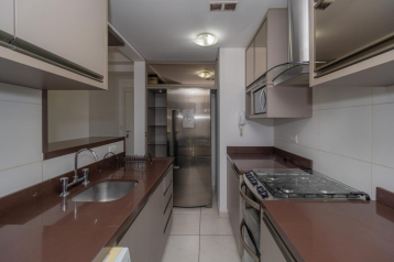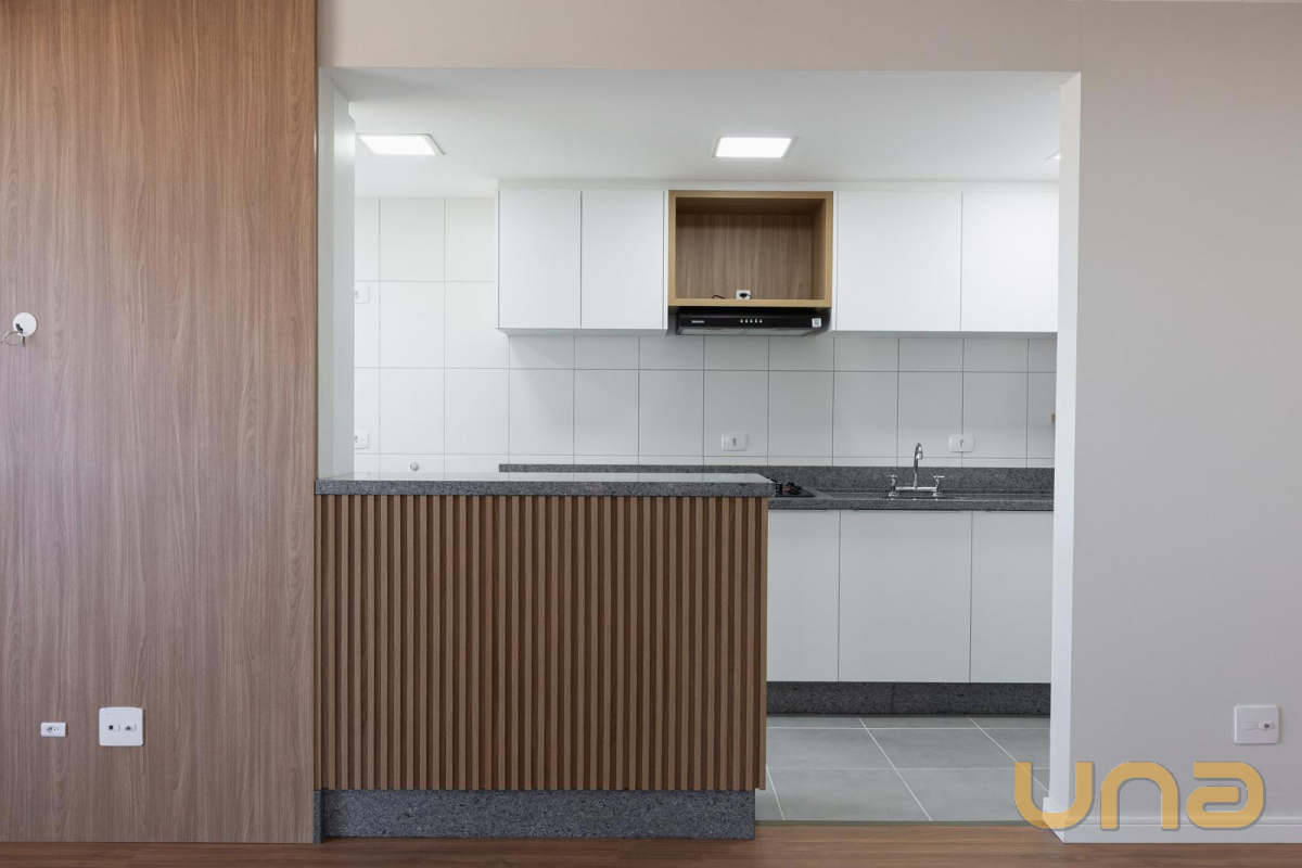 Cozinha completa com armários planejados novos, pia em granito e passa-prato que conecta com a sala.