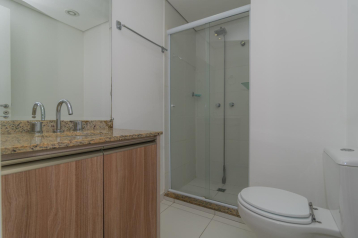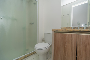 Banheiro social com acabamento moderno, ducha a gás, espelho e armário.