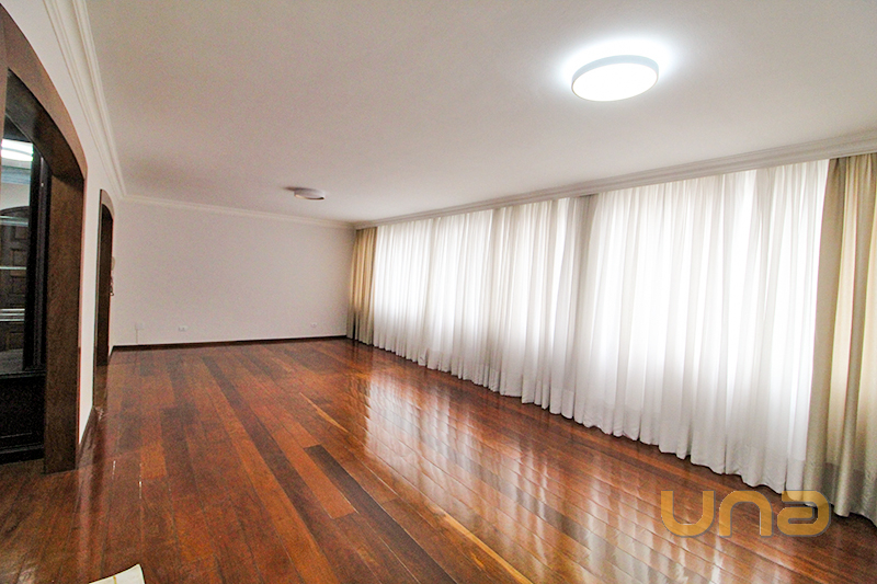01 Sala ampla com piso de madeira e cortina;