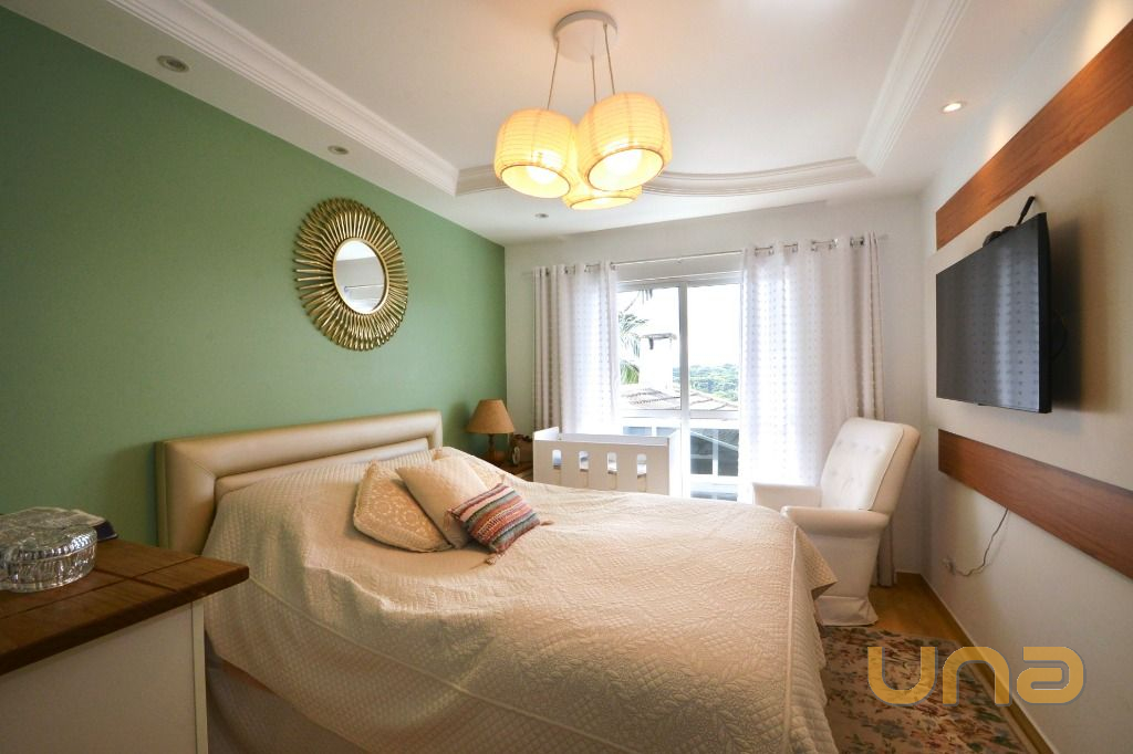 No andar superior, a suíte ampla com painel para televisão.
