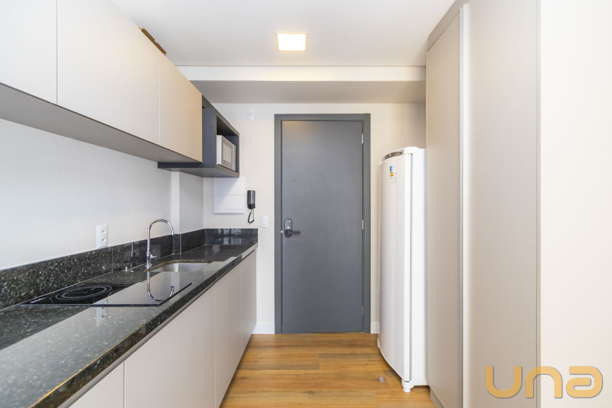 Studio completo no Residencial BF 2211, 1 dormitório totalmente mobiliado, com cozinha equipada (geladeira, fogão elétrico de duas bocas), TV, cama de casal Box, ar-condicionado e sacada.