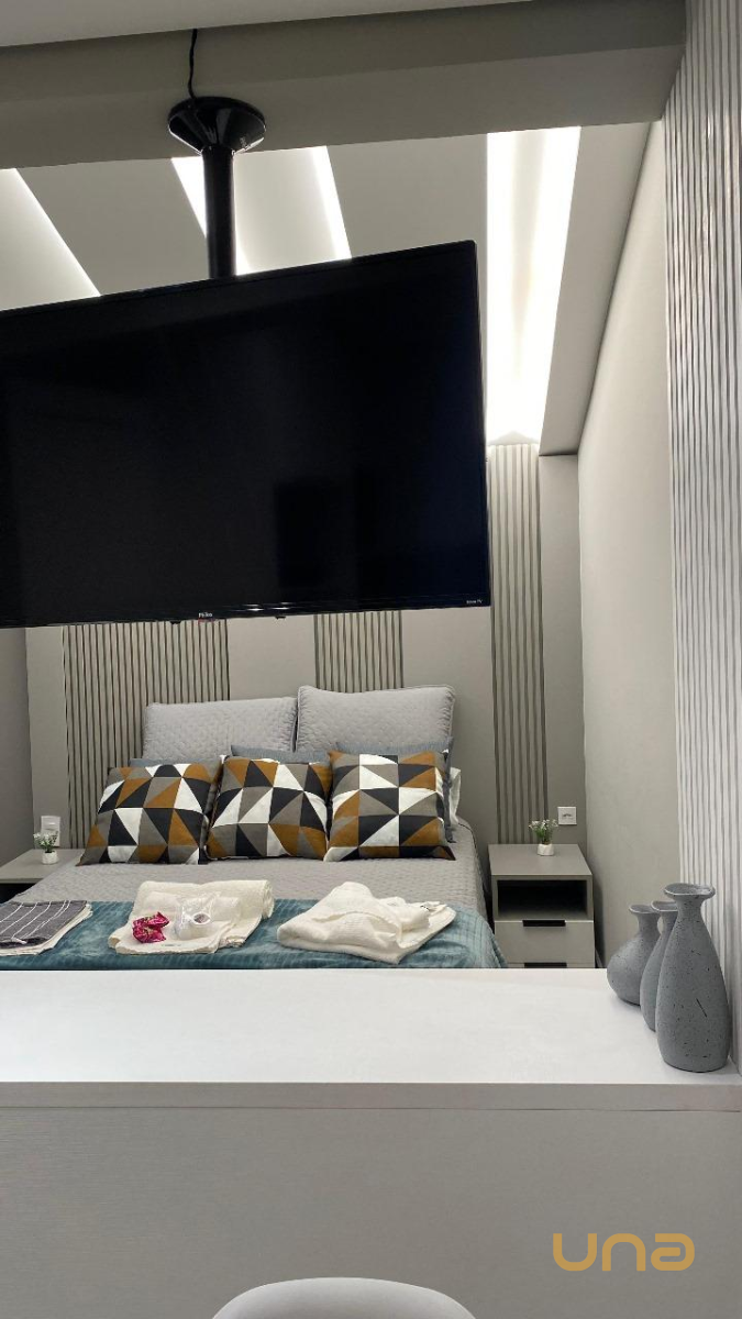 - Quarto com cama de casal, papel de parede, roupas de cama e tv.