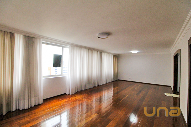 01 Sala ampla com piso de madeira e cortina;