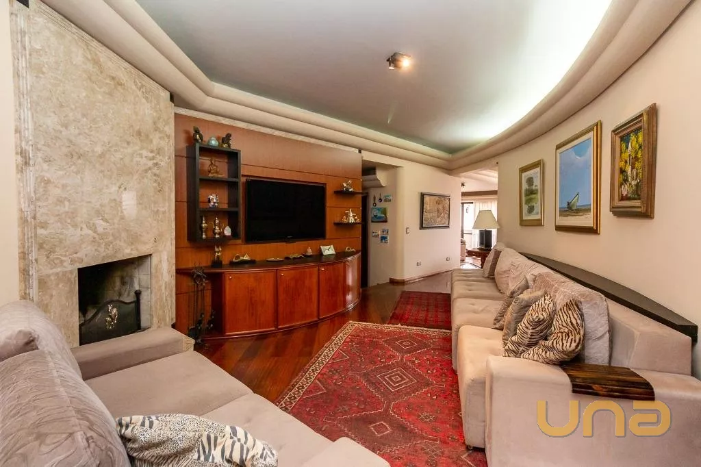Piso inferior: sala de estar para 2 ambientes com piso de madeira maciça com sacada, sala de televisão com lareira e acabamento em mármore travertino, sala de jantar com piso cerâmico de alta qualidade, muito iluminado e armário embutido com mesa em mármore travertino, lavabo, cozinha com móveis e bancadas em granito, fogão embutido e quarto de despensa, lavanderia com armários, dependência para empregada completa, suíte máster com closet, piso laminado novo e armários reformados recentemente, banheiro da suíte máster com piso e bancadas em mármore com 2 cubas e hidromassagem, suíte júnior com armários, demi-suíte com 2 quartos com armários novos, piso laminado novo com piso e bancadas em mármore.