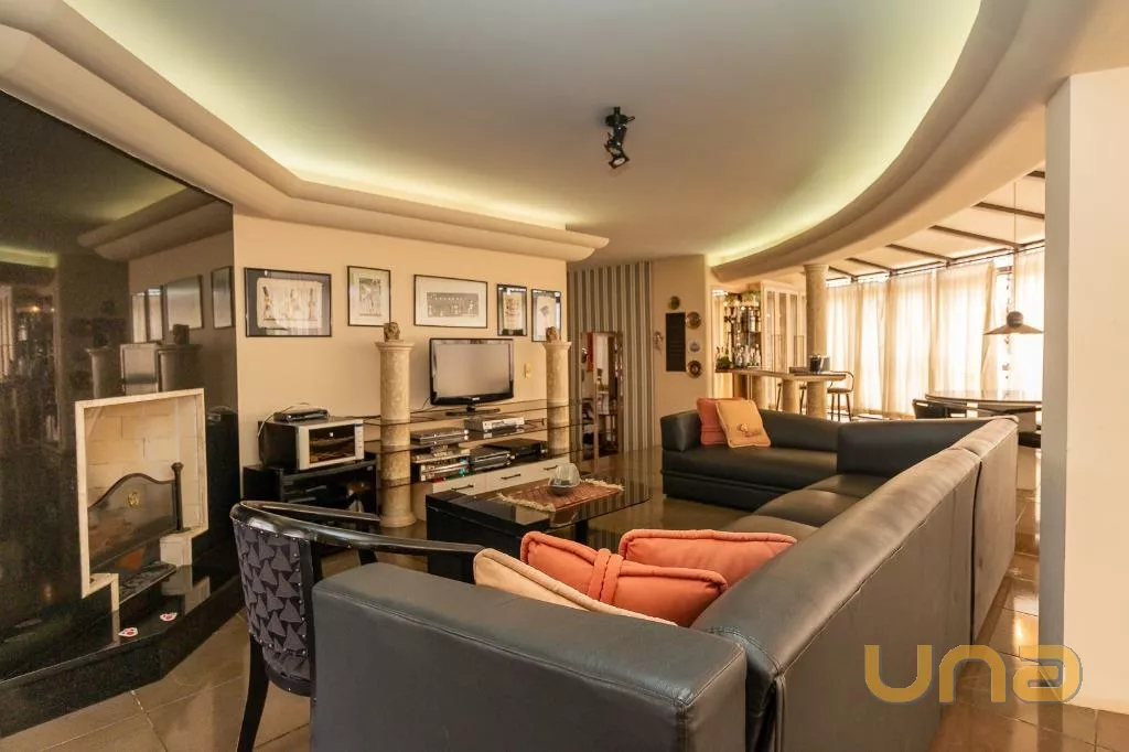 Piso superior: Escritório amplo com sacada, adega, sala de estar com lareira com acabamento de granito com portas de vidro em toda extensão com muita iluminação, espaço gourmet com churrasqueira, cozinha completa, quarto para despensa, banheiro social com tampo em mármore e preparação para sauna, terraço descoberto e com cobertura retrátil na área da piscina e deck de madeira.
